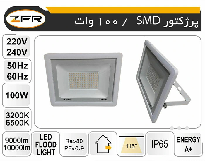پروژکتور 100 وات اس ام دی ZFR که از محصولات با کیفیت بازار محسوب می شود، نوردهی 10 الی 12 برابری نسبت یه یک ال ای دی معمولی دارد؛ به همین دلیل تولید و عرضه این پروژکتور روز به روز در حال افزایش است. این محصول در عین این که برق کمی مصرف می کند، با کیفیت نور بالا و بدنه مقاوم باعث شده در هزینه ها صرفه جویی شود. پخش نور مطلوب و یکنواخت، توان مصرفی کم، بازده نوری بالا و همچنین دوام و طول عمر بالا از برتری های پروژکتور 100 وات SMD برند ZFR است. این پروژکتور اس ام دی دارای یک منبع تغذیه است که در برابر حرارت یا ولتاژ اضافه از پروژکتور محافظت می کند و مقاومت بالایی در مقابل گرد و غبار دارد.