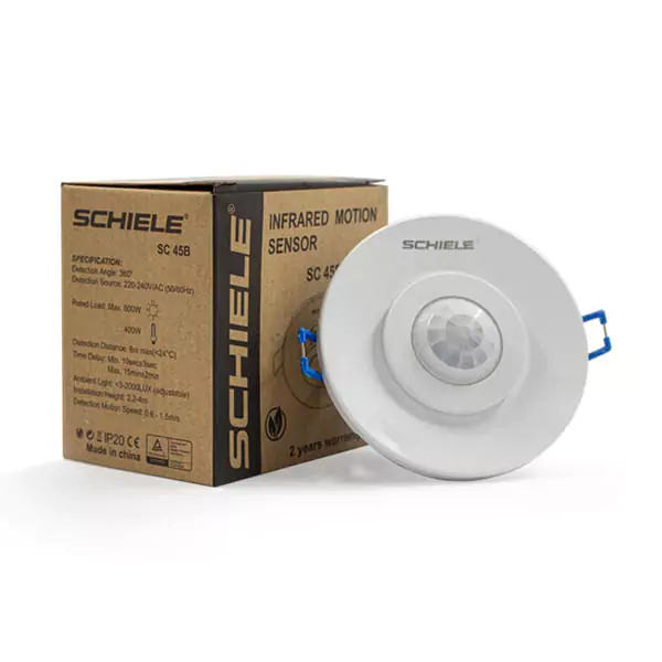 سنسور سقفی توکار شیله مدل SC 45B به سنسور هالوژنی متحرک شیله SC45B نیز معروف می باشد. وجود رویه متحرک قابلیت جذابی به این سنسور افزوده است که این قابلیت باعث افزایش چشمگیر خرید این سنسور در بازار شده است. محدوده ی آشکار سازی سنسور هالوژنی شیله اس سی 45 بی در حدود 6 متر می باشد. در این سنسور وجود رویه متحرک باعث تغییر محدوده آشکار سازی خواهد شد و به راحتی با چرخاندن رویه سنسور می توان محدوده آشکار سازی را از نظر مکان فیزیکی تغییر داد که قابلیت بسیار جذابی می باشد و بسیاری از سنسور ها از داشتن این قابلیت محروم هستند. سنسور هالوژنی متحرک شیله SC 45B یکی از زبیاترین سنسور های تولیدی برند شیله می باشد و مخصوص افراد سخت گیر و سخت پسند طراحی شده است. وجود قاب هالوژن و قرار گرفتن سنسور در این قاب دلیل اصلی زیبایی شیله SC 45B می باشد. جنس رویه این سنسور سقفی توکار نیز از پلاستیک ABS می باشد که دوام بسیار بالای در برابر دما، ضربه و … دارا می باشد. در ادامه توضیحات با ما همراه باشید تا پیش از خرید سنسور سقفی توکار شیله مدل SC 45B با تمام قابلیت های فنی و ویژگی های این سنسور هالوژنی آشنا شوید.